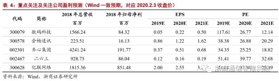 武汉火神山、武汉协和、四川华西等医院建设5G在线诊疗平台。全国中小学开学时间推迟,有望加速在线教育渗透进程。产业链调查数据显示疫情期间云视讯厂商新增用户数同比数倍甚至十倍增长。我国云视频市场已经从培育期进入成长期,预计2023年以云视频会议为代表的软件会议市场规模达到5.4亿美元,未来5年CAGR为25%。华为、腾讯等巨头加码将会大幅提升市场关注度和客户认知度,带动行业发展。2018年国内软件视频会议CR6市场份额49%,与巨头深度合作者有望获取更多市场份额,目前会畅在教育领域与华为、联通深度合作,亿联与腾讯、电信共同推出企业云视频相关产品。