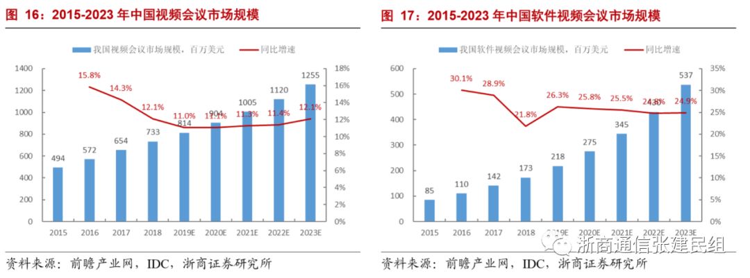 在上述因素推动下,云视频产业高速增长,正在成为视频会议市场增长的主导力量。前瞻产业网报道显示,据IDC统计,2018年国内以云视频会议为代表的软件会议市场规模仅1.7亿美元,占比约24%,预计2023年产业市场规模将达到5.4亿美元,未来5年CAGR为25%,远超视频会议行业总体未来5年CAGR的11.4%(硬件视频会议未来5年CAGR的5.1%),2023年软件视频会议占比将达到43%。
