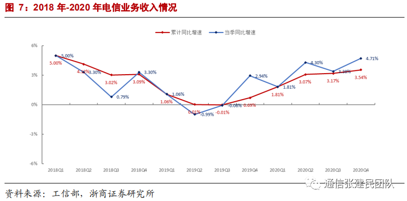 季度数据来看,行业持续向好趋势更加明确。2020年四季度单季电信业务收入同比增速4.7%,较三季度的同比增速3.4%提升1.4个百分点,其中2020年12月同比增长4.9%,11月单月同比增长5.8%。自2019年二季度单季同比增速触底以来,持续向好。