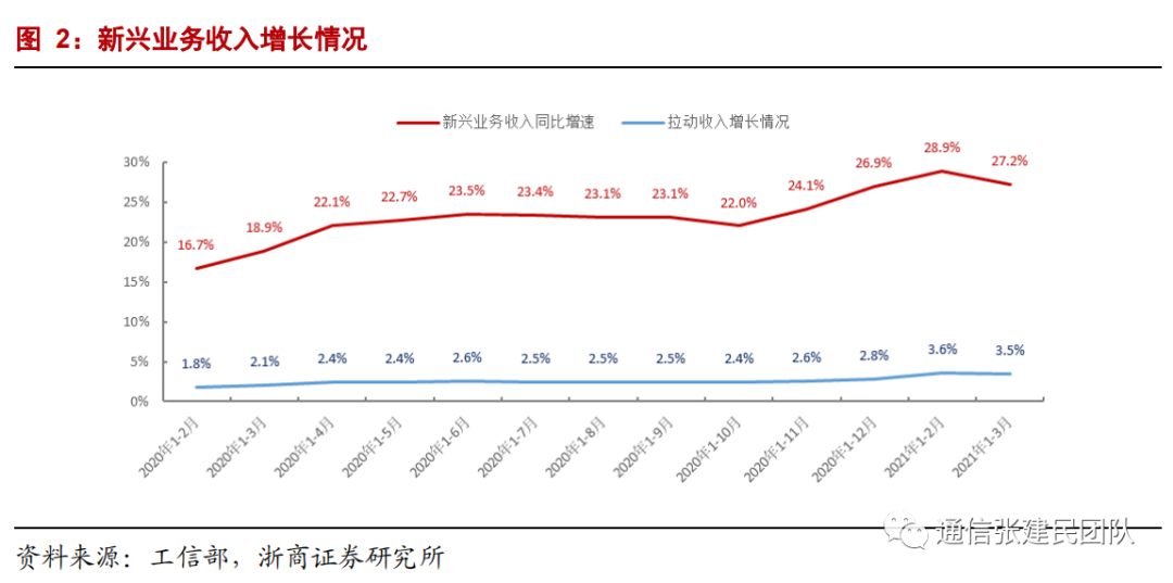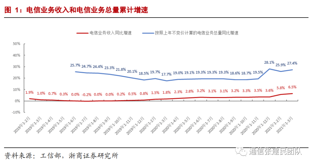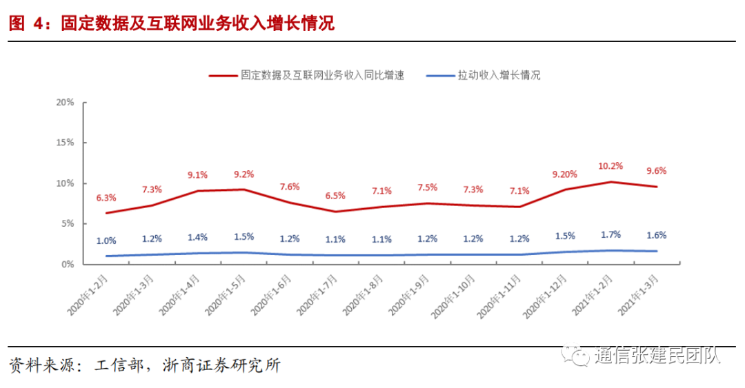 电信业务收入累计同比由2019年1-8月的0.0%持续增长至2021年1-3月的6.5%,我们之前就电信业务收入拐点形成的判断得到验证。