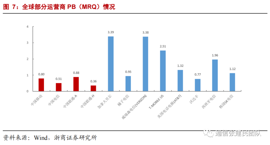 电信行业收入拐点已经形成,持续看好5G和新兴业务发展驱动行业增长。当前H股中国移动、中国电信、中国联通PB仅0.80、0.51、0.32倍,明显低于5年历史中枢的1.29、0.80、0.77倍,更低于全球可比水平1.92倍。