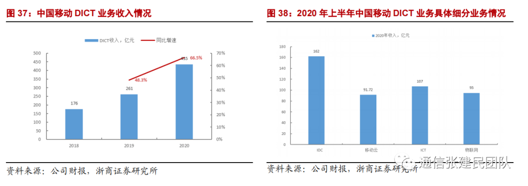 目前改革成效已经显现,2019Q4 通信服务收入恢复同比增长,2020Q3 单季利润同比转正。其中政企业务发展突出,2020 年收入达到 1129 亿元,同比增长 25.8%,尤其DICT 业务增长最为迅猛,实现收入 435 亿,同比增长 66.5%,占政企市场收入比重达到38.5%。