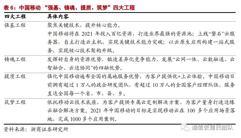 2021 年中国移动将全力推进“强基、铸魂、提质、筑梦”四大工程,从能力升级、四个融合、属地服务、行业深耕四个方面全向发力,未来三年将持续加大投入,力争三年内进入国内云服务商第一阵营。