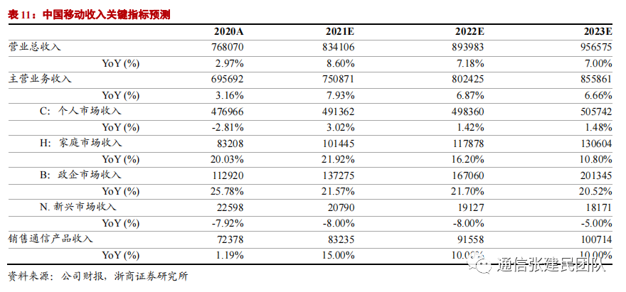 3)政企市场:增收新主力军,数字经济发展和 5G 行业应用发展带动下预期增长势头强劲,预计 2021-2023 年家庭市场收入同比增速 21.57%、21.70%、20.52%。