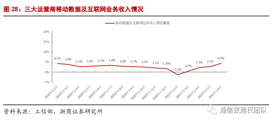 电信行业收入拐点已经形成。2020 年全年,电信业务收入累计完成 13564 亿元,同比增长 3.6%,我们之前就电信业务收入拐点形成的判断基本得到验证。2020年全年同比增速较2019年同比增速0.7%提升2.9pct;2021年上半年电信业务收入累计完成7533亿,同比增长 8.7%,增速进一步较 2020 年增速提升 5.1pct;自 2019 年 1-8 月起电信业务收入累计同比转正以来呈现加速提升态势。