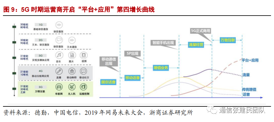 移动通信大约每十年有一个转型升级,每一次转型升级除了速率提升,也实现价值动能的转换。2G、3G、4G 时代运营商沿着“话音”、“传统增值”、“流量”三条增长曲线演进,有望在 5G 时代开启“平台+应用”的第四增长曲线。
