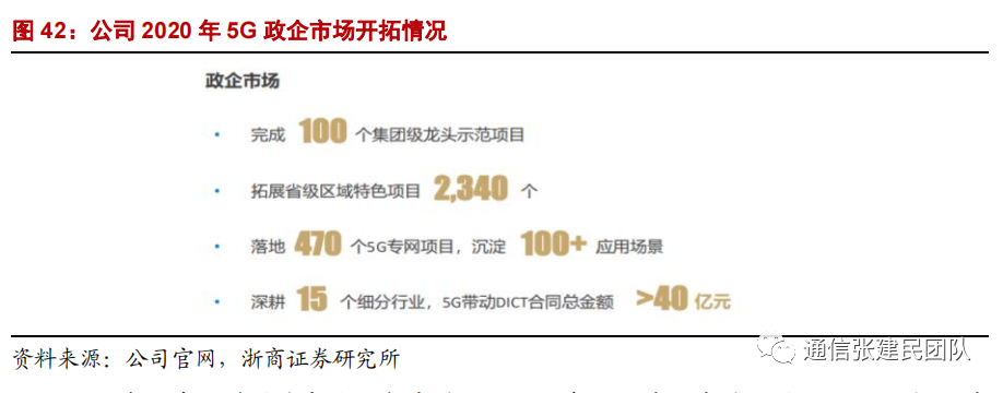 2020 年中国移动初步实现了 5G 的体系化发展,全面夯实了 5G 规模应用基础:推出5G 专网系列产品,发布“优享、专享、尊享”服务模式及 BAF 多量纲商业模式,针对客户需求提供大网切片、公有专用、专网专用三种模式,实现 5G 专网产品化;公司打造了 100 个集团级龙头示范项目,拓展了 2340 个省级区域特色项目,落地 470 个 5G 专网项目,沉淀100+应用场景,在15个细分行业推广的领跑优势逐步显现,带动5G DICT合同超 40 亿元。