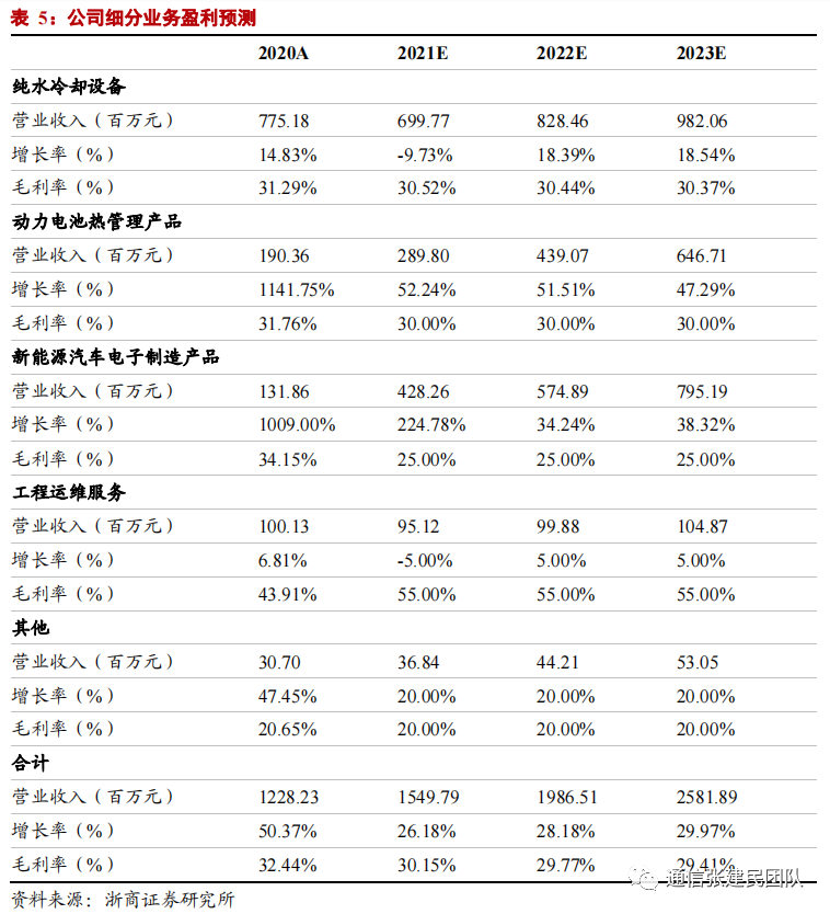 2)动力电池热管理:公司动力电池热管理业务一方面直接受益新能源汽车产销的快速提升,另一方面公司持续扩展品类,并且布局配件级产品向系统级产品的升级,叠加公司在储能等新领域的布局,预计公司动力电池热管理业务将快速增长。基于对未来新能源汽车销售量、当前客户情况、产能储备情况、动力电池液冷/储能等行业发展预期的假设,我们预计公司动力电池热管理产品2021-2023年同比增速52.2%、51.5%、47.3%。