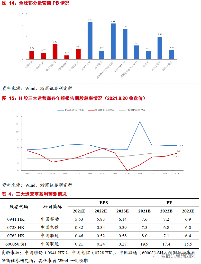 回A有望提升港股运营商估值。中国电信已经于8月20日完成回A发行,截至当前A股中国电信PB 1.32倍。当前H股中国移动、中国电信、中国联通PB仅0.73倍、0.57倍、0.34倍,明显低于5年历史中枢的1.20倍、0.71倍、0.72倍,更低于全球行业可比水平的1.80倍。