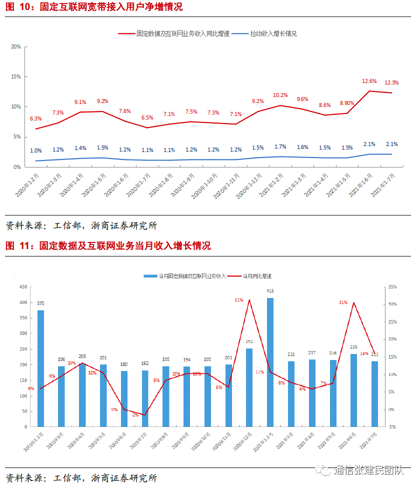 2021年上半年,三大运营商完成固定数据及互联网业务收入1505亿元,同比增长12.3%,在电信业务收入中占比为17.3%,拉动电信业务收入增长2.1pct。7月单月,三大运营商完成固定数据及互联网业务收入211亿元,同比增长15.9%。