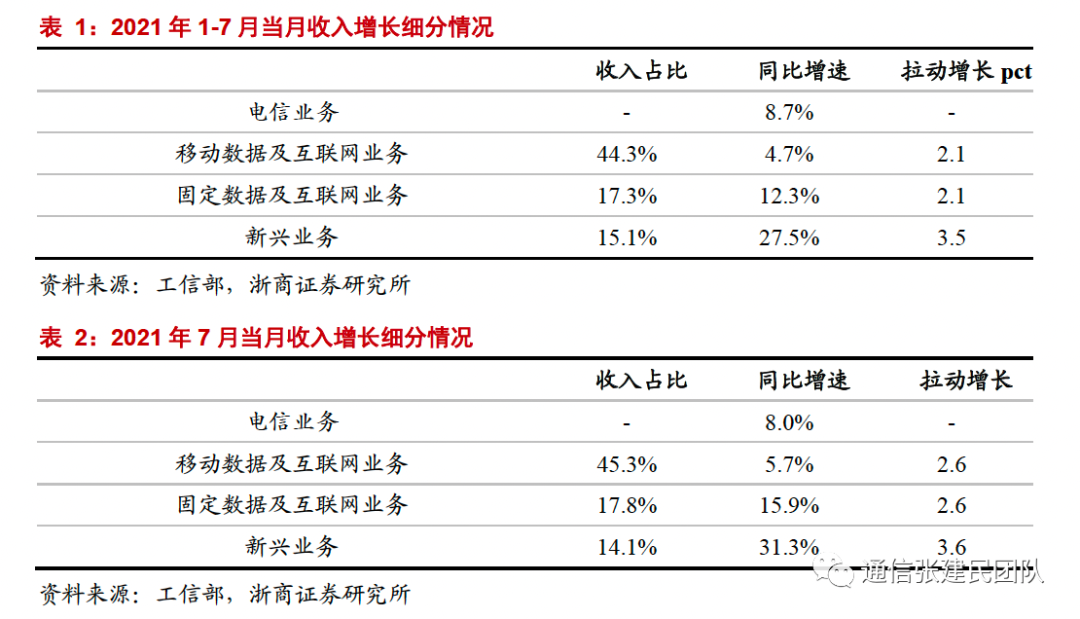 7月,电信业务收入同比增长的8.0%中,新兴业务、移动数据及互联网业务、固定数据及互联网业务分别拉动增长3.6pct、2.6pct、2.6pct。