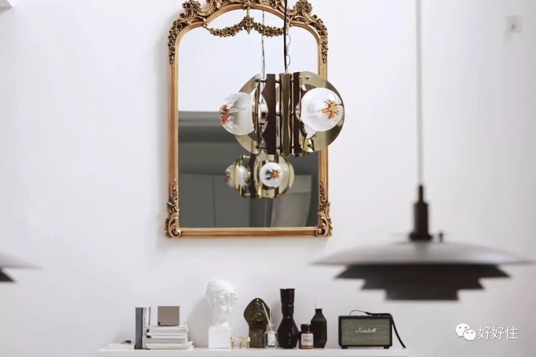 ▲ 中古的扶手椅、中古黄铜吊灯搭配鎏金镜子