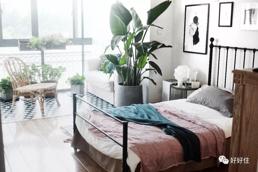 二楼的另一件房间是设计师Stefny的卧室,选择了橘粉+绿灰的搭配。微妙的色调变化带来无限可能才是莫兰迪色彩的精髓。