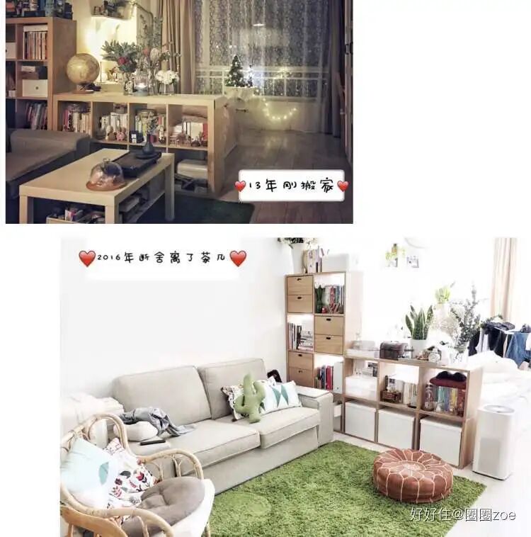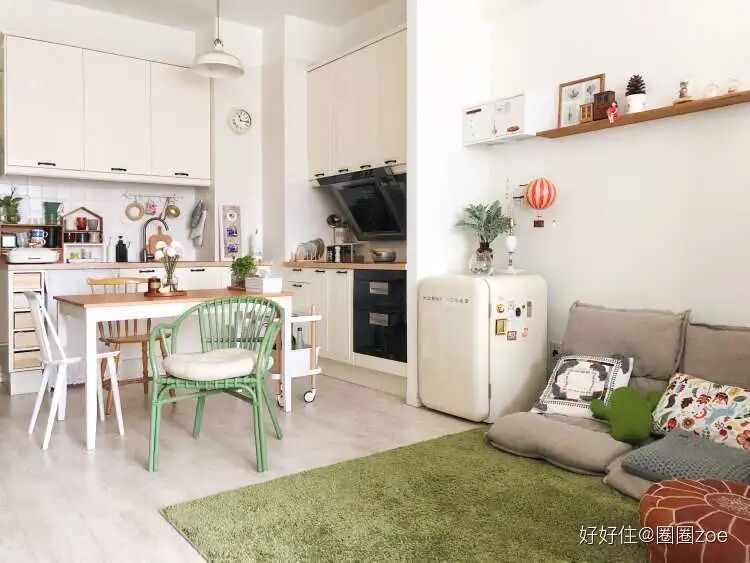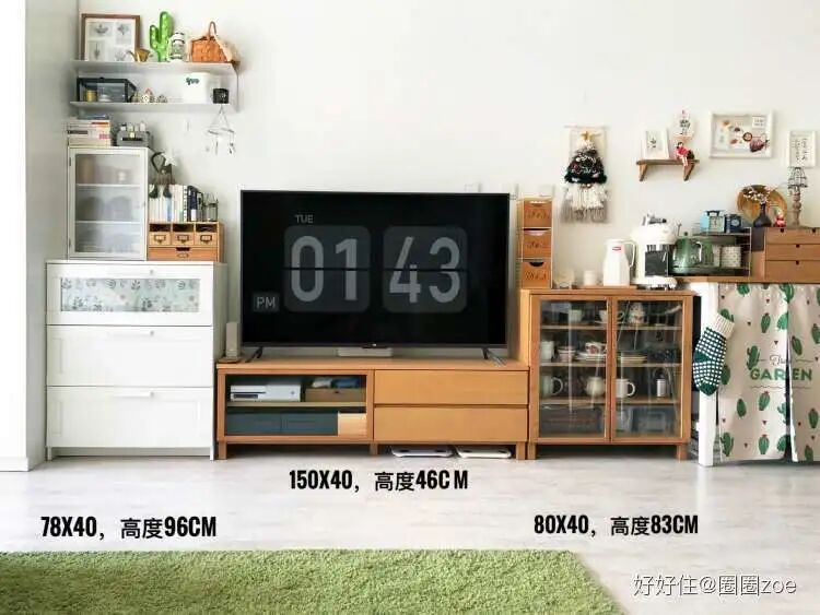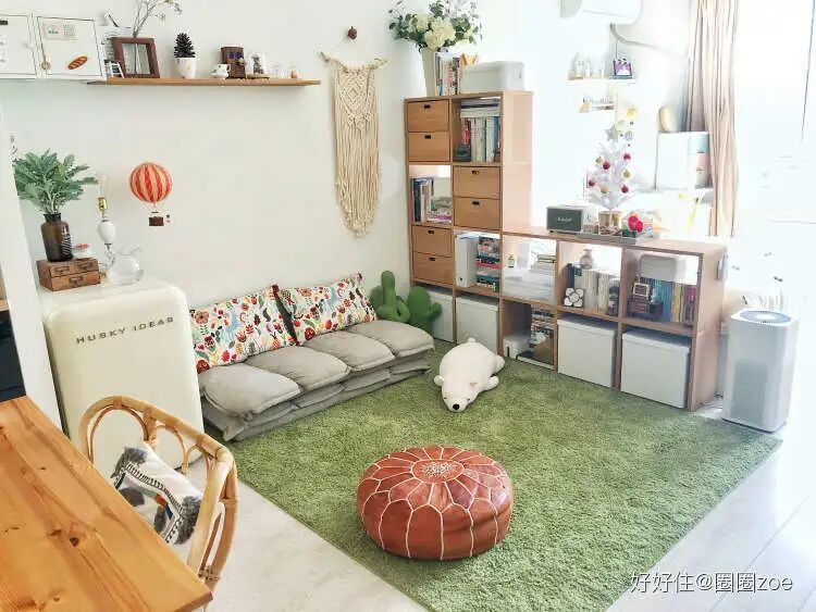 屋主说:2013年的冬天,我俩跟着中介小哥一踏进这间屋子,阳光洋洋洒洒的落在地板上,好像对我们说,欢迎回家。13年这张是沙发茶几还在的时候,新家用的大部分是租房时的家具,之后慢慢更换。16年这张是准备断舍离掉沙发时拍的,下一任主人在楼下等着,匆匆拍了一张。现在的样子。地毯原本是宜家的,超级喜欢这个绿色,就像躺在草地上一样,因为想要更大尺寸的,于是在muji重新定做了差不多的颜色,是整个家的灵魂!因为楼下买菜吃饭相当方便,24 小时超市和整条街的餐厅饭店,网上生鲜配送只要十几分钟,冰箱里往往只有饮料和面膜,直到这次疫情,塞满后的菜够两个人 4-6 天的一日三餐。客厅和卧室之间用一组书柜简单隔了下,既不会挡住好阳光,又有强大的收纳能力。白色收纳盒是宜家的,刚好可以塞进muji的格子柜里,里面收纳按摩仪,健身小物件,桌游/毛绒玩具等等,平时可以在绿地毯上做keep,累了就躺下来按摩,也方便玩桌游,看电影。总之没有了沙发和茶几,功能变得更多了。格子柜这里放了接线板,附近的空气净化器、音响、小夜灯都从这里接电,摊在地毯上时也方便一边充电一边刷手机,充电线从上面的格子一路可延长到床上。要夸一下muji的pp抽屉式储物盒,调转方向也可以叠加上去卡住,一层朝向床,二层朝地毯这边,灵活多变。床的这一边,方格子完成了床头柜的功能,睡前充电在这里,香薰机转个方向就可以香香的伴我入眠,夜灯有定时功能。宜家的抽屉柜和muji的电视柜厚度都是40cm,混搭无压力,收纳能力满分。小米60寸的电视,尺寸和气质上都卡的死死的。具体尺寸都在图上了。