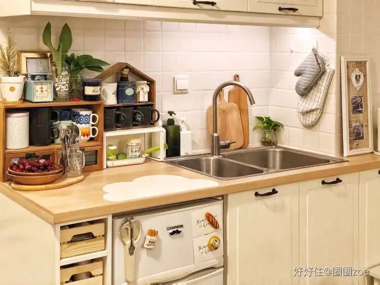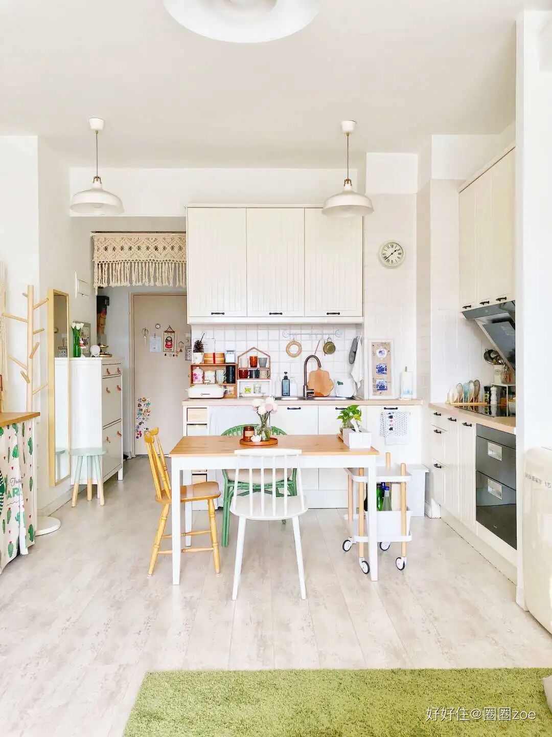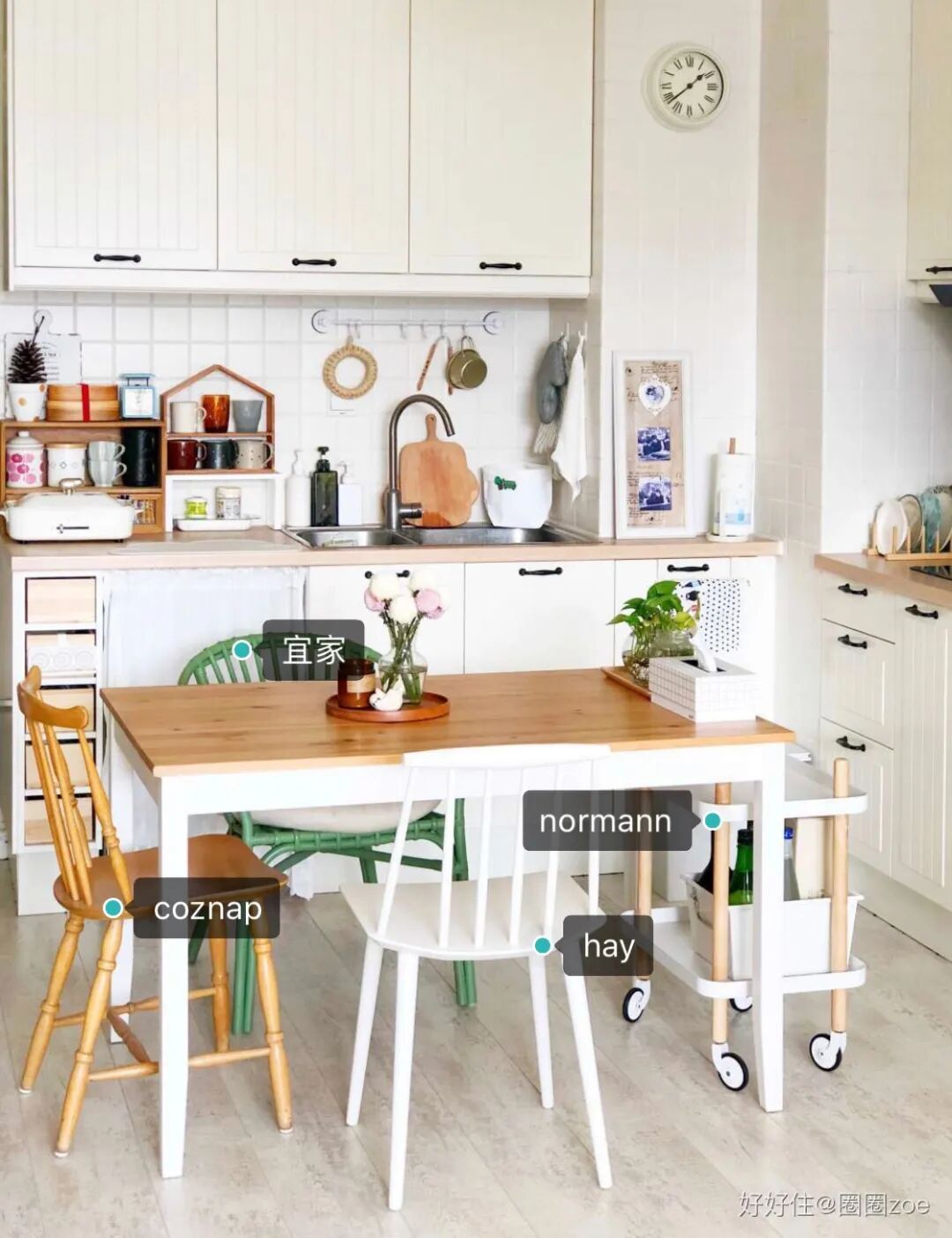 因为台面时常摆着东西,干脆把小木盒反过来放,这样从上面拿取小抽屉里的杯垫就方便多了。13年装修时市场上的小白砖还不多,是跑遍了北京的大大小小的建材城,才找到这么一款心仪的,肉眼看上去是温柔的哑光奶白色,表面有凹凸不平的纹理。又是刚刚好,闲置的宜家接线板盒拿来做保鲜膜收纳盒。常用的锅就三个,煎锅,大蒸锅,雪平锅。烘焙用品收纳的原则也是,盒子满了就不能买了,想入新模具就把旧模具卖掉。个人觉得地板越浅其实越耐脏,选了做旧效果,想着以后万一磨坏了不容易看出来,但其实强化复合地板真的非常结实,完全没必要担心磨坏的问题。🛒 好物清单