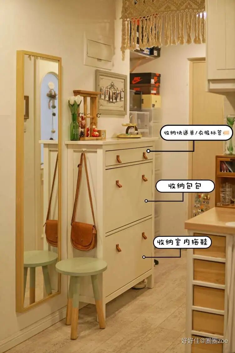 因为鞋盒的数量是固定的,摆满之后想要买新鞋,必须先卖掉一双,就这样来控制买鞋的速度。上面用搁板放鞋的原盒。男生的帽子没地方收纳,落的全是灰,买了两个横版鞋盒回来试试,断舍离了几顶帽子后还是没能全放下。大部分帽子都是黑色,选择黑色盒子方便隐身。鞋柜换了皮把手,一层小抽屉放平时的收据快递单。下面第一层收纳日常出门带的电脑包,第二层收纳家居拖鞋。这里偶尔也充当临时化妆台,最近又添了消毒用品。鞋柜侧面有个小壁挂,收纳雨伞和拆快递的剪刀。防盗门是日上,选了个温柔的颜色,不会太白也不会太深。蘑菇铃铛声音不大,音色很舒服,每次回家都能有被迎接的感觉。在餐桌看向玄关的样子,这个角度总能看见玄关上方的鞋盒,忍不了定做了挂毯当帘子挡一下。🛒 好物清单