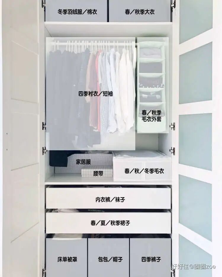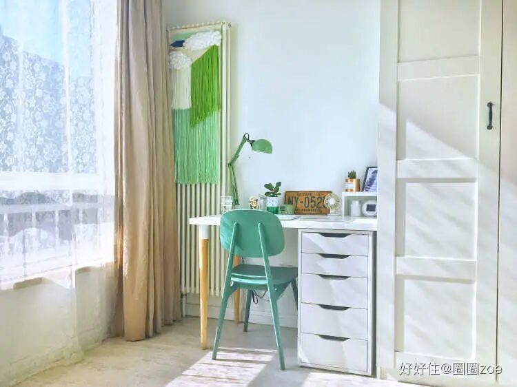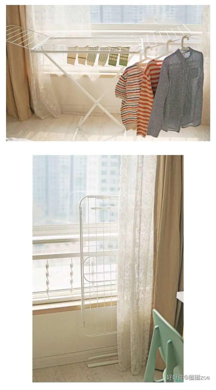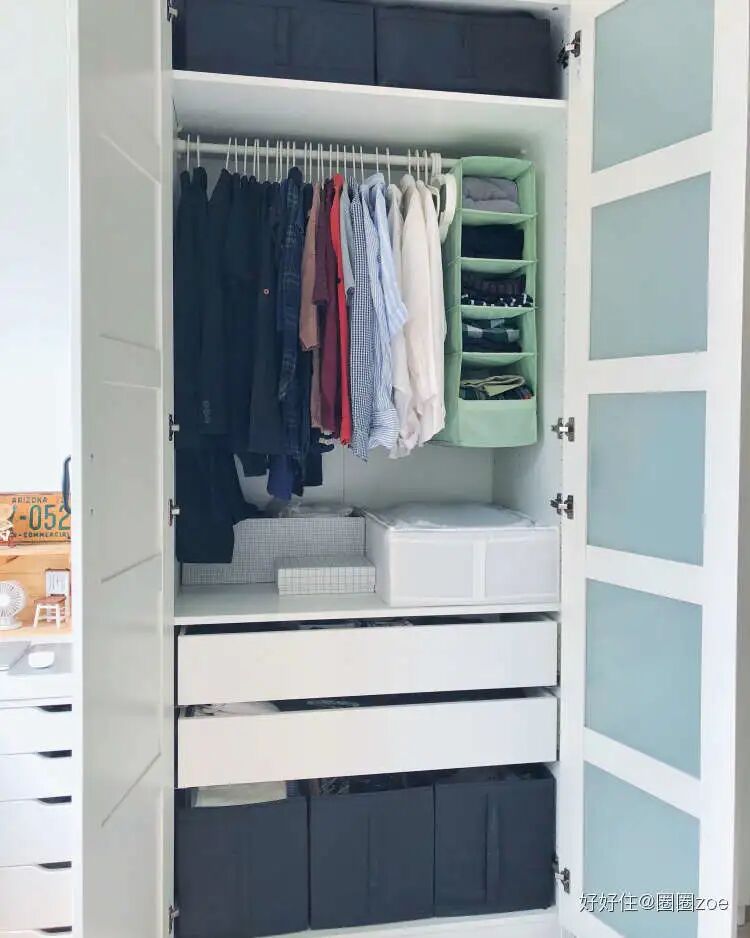 床是宜家的马尔姆系列,买它主要是因为造型简单,存在感小,再有就是储物功能强大。床下存放一些电器的包装盒,替换被子和一些闲置物品。@圈圈zoe 认为储物空间不需要太大,越大的空间越会被闲置物品填满,家里储物空间紧张反而让自己克制,不会去囤积没必要的物品,一切够用就好。家属的工作台在另一侧。老车牌是朋友从美国淘回来的,数字正好是家属的车牌号,也是家属的生日。一年四季的衣服都在这里,乍一看感觉衣服会太少,但只要保证衣柜里的衣服每一件都是喜欢的,并且会穿很久,这些衣服是足够应付四季的。仍然是入一丢一的原则,屋主在买衣服这件事上控制得很好。家属一直自己整理衣柜,空间虽然太迷你,但随时打开柜门,都始终保持这种不乱的状态,完全没有让@圈圈zoe 操过心。晾晒衣服就用一个折叠晾衣架就够了,平时不用的话可以藏在窗帘后面。🛒 好物清单