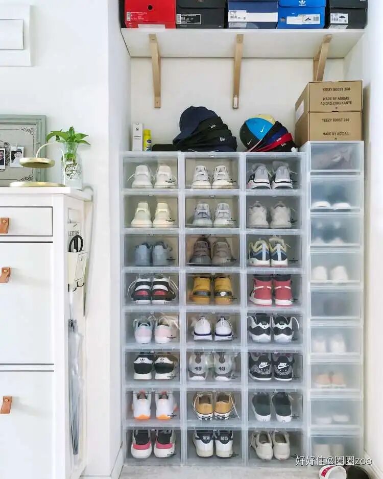 进门玄关一侧有个凹槽,主要放蜈蚣精囤积的鞋子和帽子。受到尺寸限制,直接放了三列鞋盒,一列收纳箱,circle storage鞋盒放男生的 AJ 也放得下,透明盖子很方便拿取;muji的抽屉式收纳盒尺寸略小,放女生的鞋子正好。