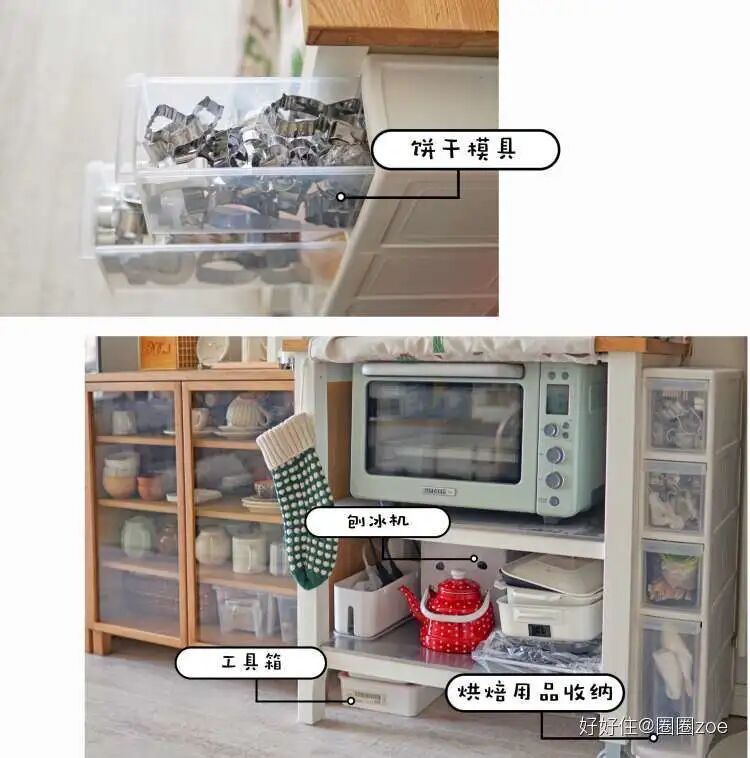 不喜欢成套的餐桌餐椅,餐椅都是不同时期买的,看见喜欢的就买一把,有时候也会和书桌的椅子换着用,不管怎么组合都很搭。normann的小推车的尺寸和宜家的桌子简直绝配,下层用来存酒,上层用来放临时的杂物~之前的烘焙区长这样,但是因为入了咖啡机,现在还是把烤箱收纳到了仙人掌帘子后面。为了把烤箱收纳进来,卸掉了桌板下面的一层挡板,现在勉强可以打开烤箱,不影响使用。下面一层放了接线板、Bruno料理锅、刨冰机。旁边硬塞了个夹缝抽屉小车,收纳常用的烘焙用品,精打细算不放过一丝空间。muji 餐边柜里放了一部分餐具,作为餐具控的屋主,买餐具是唯一控制的不好的地方,感觉柜子里总是少那么一件……每天做饭精心挑选要用的餐具,就像挑选出门的衣服一样,当然也会定期把闲置的送人或卖掉。🛒 好物清单