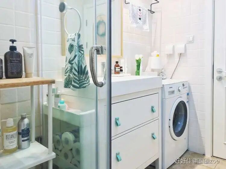 卫生间不大,但是没有太鸡肋的区域,用起来很顺手,全屋唯一一个带门的空间。洗手台和镜子也是全套宜家,夹缝小推车平时看不见,用时抽出来就好。关于洗手台的高度,网上给的计算方法是身高的二分之一减去十,举个例子,你180cm,那么:洗手台高度=180/2-10=80cm。但真正看了洗手台样品,结合自己以往的使用经验,最后选择的洗手台总高度是92.5cm(屋主身高173)。从13年使用到现在,结论是非常舒服,不会觉得弯腰很累。这个真的是非常个人的选择,即使同样身高使用习惯也不一样,所以仅供参考。卫生间冷光暖光都有,化妆的时候色温很合适,但平时只开一盏宜家的小台灯,这个小灯很好用,因为灯泡没有裸露在外面所以很安全,塑料材质也防水,照明足够。晚上睡觉后也不用关,昏黄的光线从厕所磨砂门透出来,客厅也不再是漆黑一片了。宜家的毛巾架,毛巾挂在这里一段时间发现很不顺手。索性淘宝定了个隔板直接放上去,这样就可以放些收纳盒,顺眼多了。洗手台的另一边是马桶,最普通的款,用着还算省心,宜家的脏衣收纳凳尺寸刚好,平时还能当小桌子放些香薰卷纸手机之类的。🛒 好物清单