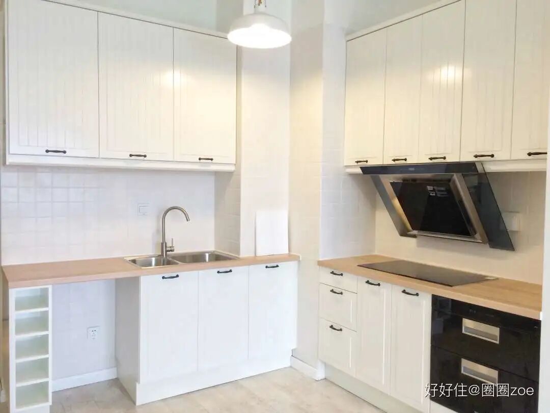 刚装修好时的厨房照片,厨房台面就是宜家最老款的仿木纹,并不是实木,颜色浅浅的很温暖,用了多年还是很爱它。相比明火更喜欢用电磁炉,西门子的抽油烟机安得很低,这样吸油烟效果特别好。水槽旁放个小云朵餐垫,洗好的碗可以先放在上面,最后统一放进消毒柜。绿色的muji分装瓶放洗碗精,白色瓶子一个是洗手液,一个是按压式护手霜,这样就不用每次刷完碗再跑去厕所擦手了~