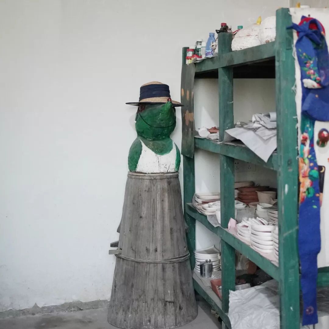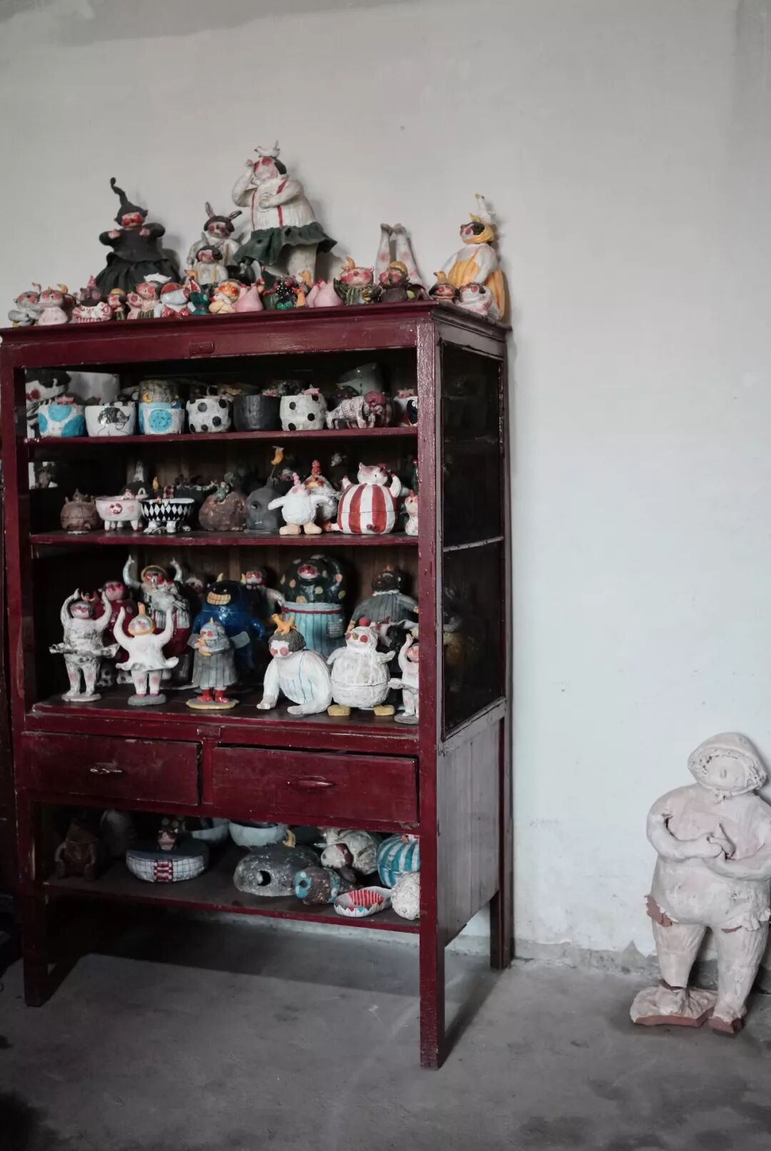 吹云者所创造的,与其说单纯就是不同小人小动物,不如说每一只都是幻化成不同形态、代表着自己某个状态的自己。而最近这一段时间,她开始尝试一些大型雕塑的创作。2018 年底,想做一只大鳄鱼,但后来炸掉了,干脆把断掉了的鳄鱼头搬回房间,现在它放在桌上,当做花器。因为对鳄鱼实在太喜欢了,在这之后又重新做了一只,但依旧没成功,这只却被精心修补粘成了比较完整的鳄鱼,被放在她的工作室的架子边,还戴上了礼帽。成功制成的陶器是装饰,而失败了的、炸掉了的陶器又何尝不能成为家里的一景呢?她是在 2019 年 3 月底完全搬过来景德镇。但其实,2017 年从上海公司离职后,就来这边短暂住过一阵。景德镇房租低,不自觉一下住了半年,这半年开始学着别人做陶,也开始发现做陶的神奇之处。△ 景德镇旧货市集上收的老柜子成为了一部分小人们的家。