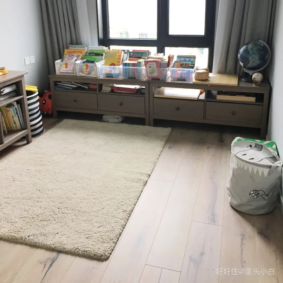 阅读角⑥ 虽说是玩具室,依然非常「鸡贼」地,把玩具塞到了抽屉和大衣柜里,外露的还是只有书。从之前的家搬过来的电视柜也用作书架。