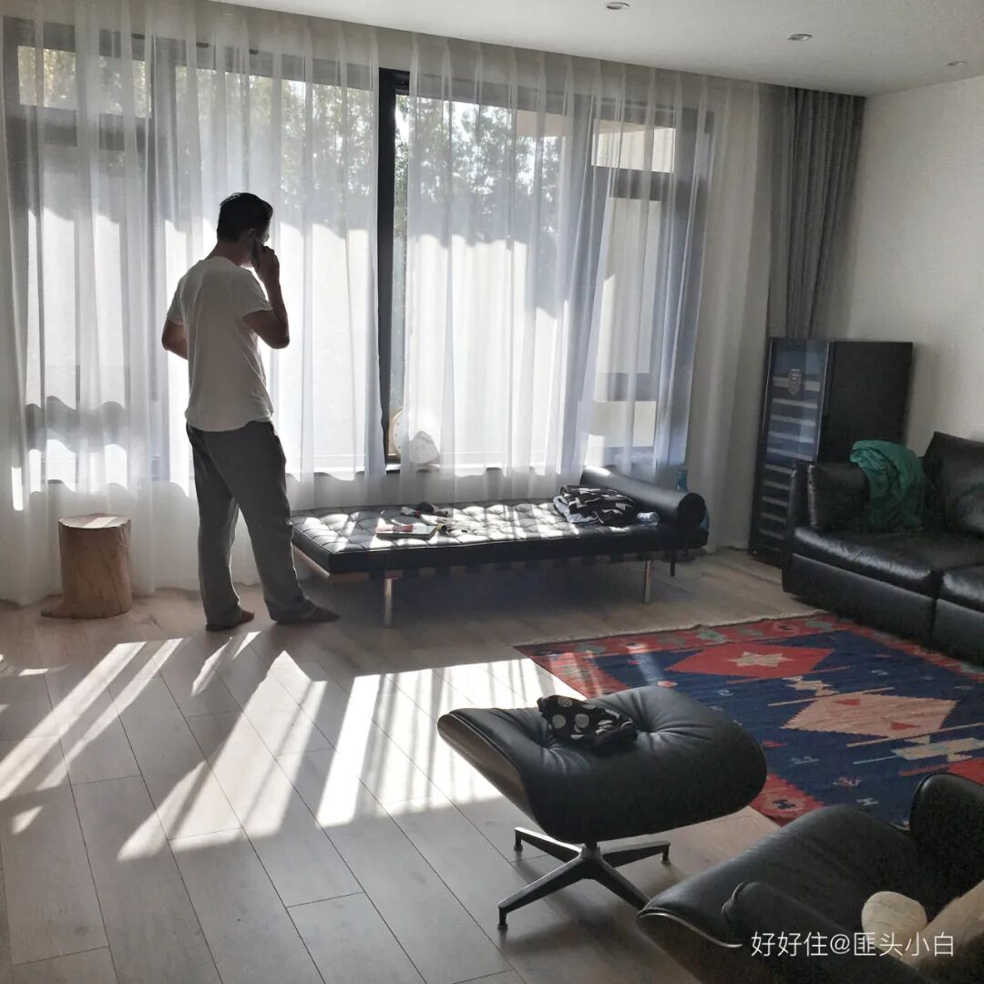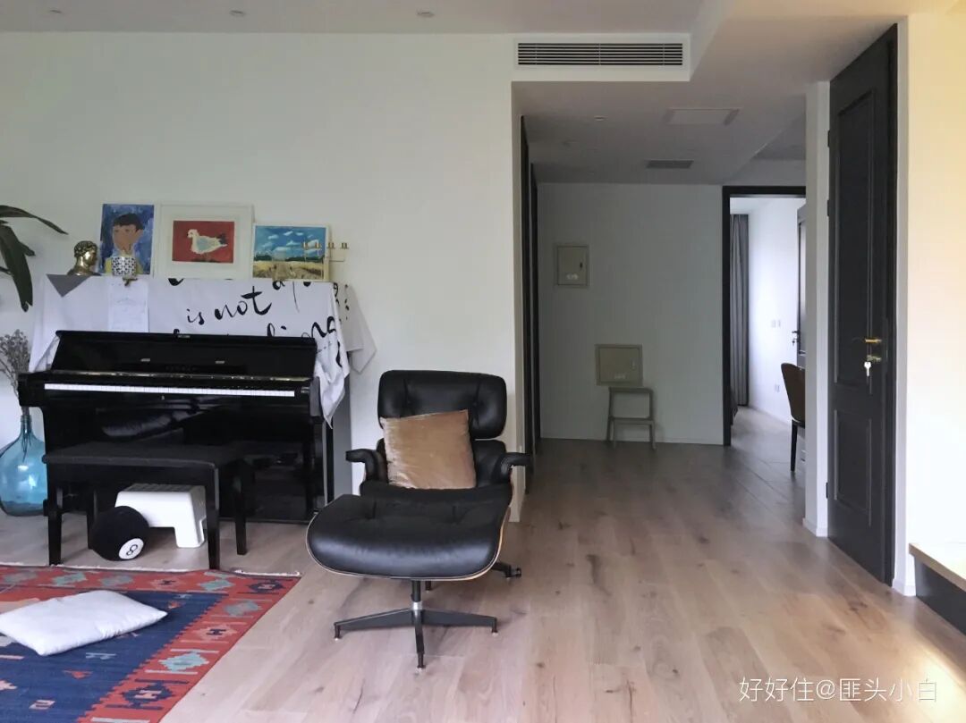 如今搬进 200㎡ 的大房子,反而更追求「极简」。用@匪头小白 的话说,年纪大了希望入眼都是简单不闹腾的。身为建筑师的先生,也始终有个极简梦。所以这个家四白落地,能隐藏的都隐藏,用色和线条也都干净利落。