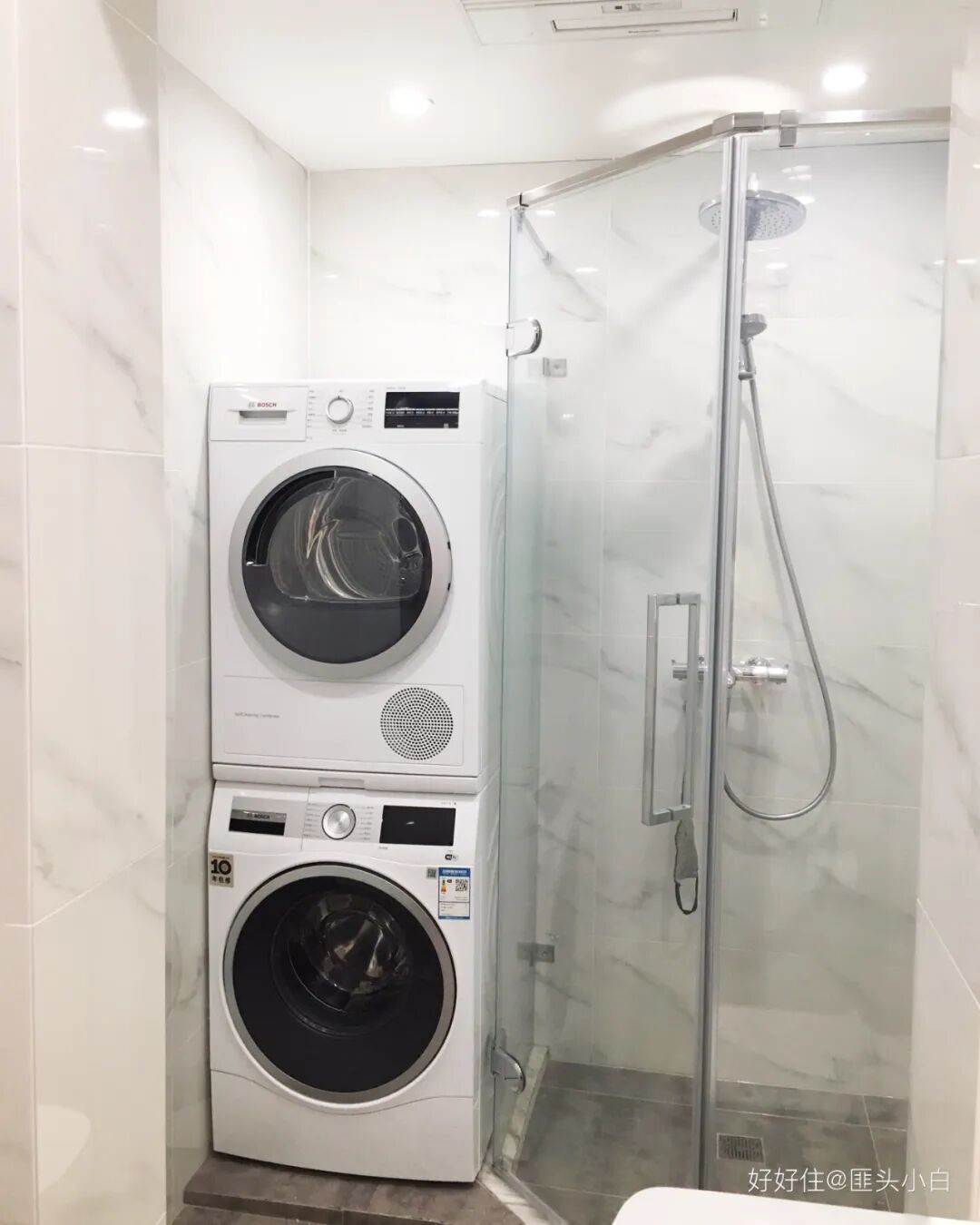 客卫都是干湿分离,洗烘设备都选用博世,原空间尺寸卡得极严,安装颇费了一番功夫。淋浴房直径90cm,因为是老人使用,所以外开门比较安全。