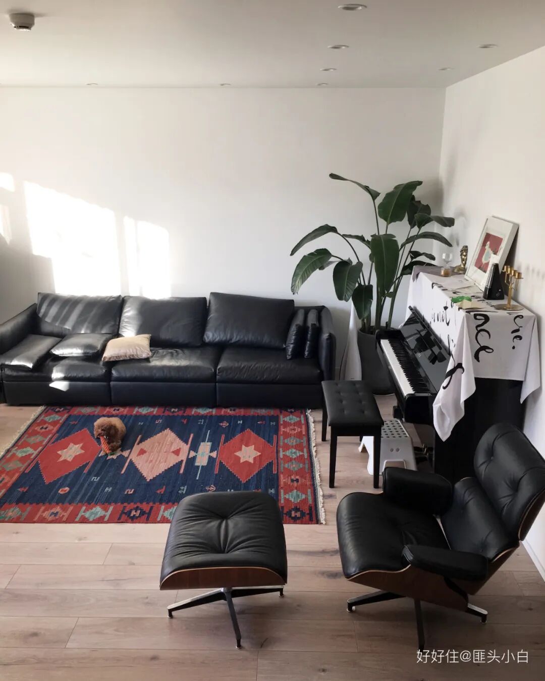 客厅无电视、无茶几,通过不同高度的坐具进行围和。色彩丰富的地毯中和黑色家具的沉闷感。超大皮质沙发好打理,很适合多口家庭。下图是刚入住,往下慢慢看客厅是如何被孩子占领的。😂