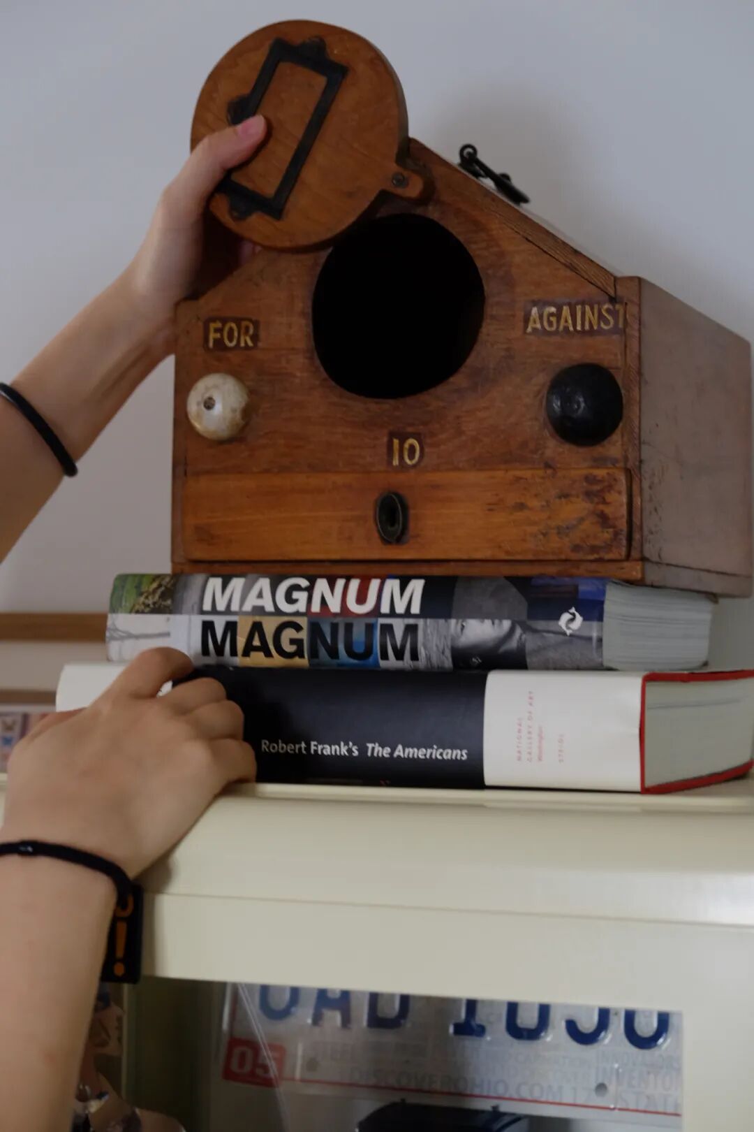 前往吃吃家之前,她发了两张图片指南给我。在做 Airbnb 房东期间,这个指南曾帮助许多住客顺利找到楼门。据说这个灵感来自 1906 年在美国出版的Photo-Auto Guide,即用纯照片的导航指示代替传统地图。每本书是一个线路,展示沿路的路口、桥梁和地标相片。也算是公路摄影最早的形式。为了给相聚于此的陌生人之间建立联系,她还开起了一个小的项目。让每位住客回答一个问题,再为下一位客人留下一个问题。第一位住客是来北京参展的插画师,画满了整整一页。后来还有一对母女相继来住,女儿留给妈妈的问题是:如果重头再来,你会选择什么样的工作。制作给房客的小标识:如何打开卫生间的灯;水龙头从哪边转出热水。在柏林的一个跳蚤市场购置的宋朝时期的北京地图。希望为家里增加一些北京元素。负责招待客人的小橘猫名叫 Ori 的。聊天的过程里,它一刻不得闲,跑来跑去。四年前, 我的朋友捡到一只小猫,拍照问我想不想收养。看到相片的瞬间,我就觉得这是我的猫。她的名字有什么特别的意义吗?我不太能确定它的拼写。O-R-I,在希伯来语里代表「光」。名字来自游戏「Ori and the Blind Forest」,里面有一个精神力十足的小光点就叫做 Ori ,在黑暗里勇往直前。此外 Ori 的读音又像是 orange,是小猫的品种。在吃吃的家,能感受到一种自由、嬉皮却有序的氛围。她最喜欢的一座城市是Portland(波特兰),这座城市的精神恰好是「Keep Portland Weird」。带着这样的视角再去看吃吃的收藏与喜好,许多迷惑会得到答案。从顺义的古家具店东舍购入的一个投票箱。从上面打开后,手伸进去会有两个管道,一个代表支持,一个代表反对。纸条通过管道会滑到下面的抽屉里。吃吃说,之后朋友们来家里,可以用这个投票项决定晚饭吃什么。Kit-Cat,20 世纪 30 年代开始生产的一款钟。曾经出现在《回到未来》的博士家里。写着 GAB105的 贴牌,是吃吃在美国读研究生时的车牌,后来跟随她一起回国。柜子里有许多台相机。里面有一台被称作「拥有后就终结对其他拍立得相机购物欲望」的老机子。机身是宝丽来,但后背用富士拍立得改装。不仅拥有素质特别好的镜头,同时相纸可用价格相对便宜的富士宽幅相纸。去年在 abC 书展上偶遇一位香港摊主的画。画讲的是店主自己家里有很多猫,每天都会叼不一样的东西回家。这个感觉像是猫在家里开了很多杂货铺。收藏在家里不同主题的手工立体书。一个翻阅立体书的小tip: 在进入下一页前要完整合上前一页,有助于书的保存。看到你的家里充满了与波特兰有关的事物,能分享一件在那座城市里记忆深刻的事吗?有一位老奶奶开了一间只卖灯泡的杂货店,她每日会以灯泡为主题画漫画。还有道路在很久前是马道,因而路两旁会设有拴着马的环。现在城市里的人还会特意将玩具马拴在路旁。「手工」是与吃吃生活里不可或缺的一部分,DIY 不仅是一种生活的选择,同时也是帮助她构建生活的一个方式。靠窗边的工作台上有一个Making Magic的霓虹灯牌,这有什么特别的故事吗?这个角落像一个小小的工作坊。做手工的时候让它保持明亮,仿佛整个过程在创造魔法。我买了一个切割机。用它做了不少好玩的东西。在电脑上画好图案,连接设备切割后,会为后续的创作提供更多的可能性。印有 100% NATURAL 的自制天然清洁剂与家务体系排期表。