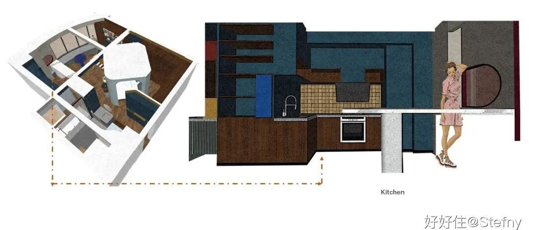 ④开放式岛台背后做了挡墙,分割的区域用于晾晒。
