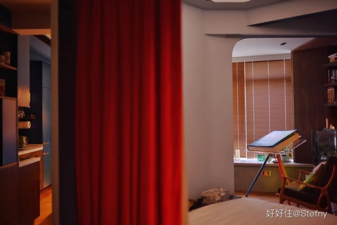 卧室两侧皆有圆角的门洞与门帘。而两侧的门帘被分成了蓝色和红色,即分别呼应了红黄蓝的主题色,也是双方喜好融入的表现。
