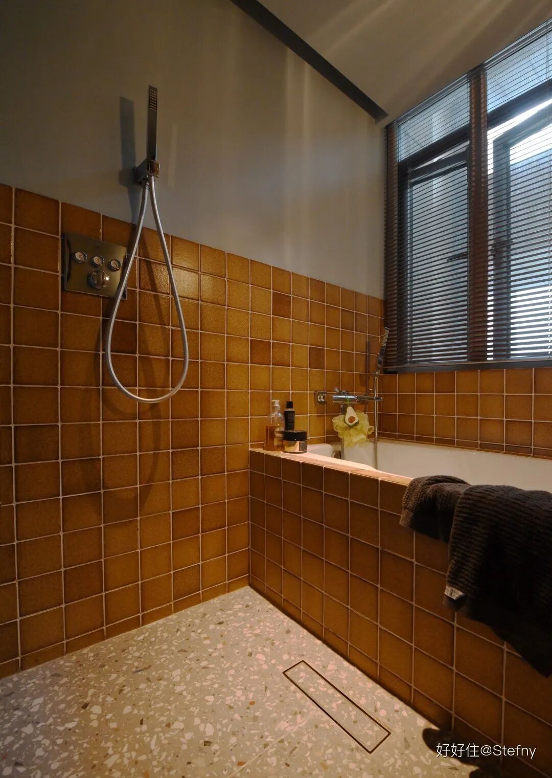 淋浴背景砖参考欧洲老式浴场设计元素,用黄色手工砖制作了一个弧形壁龛,中间点缀中古壁灯,营造戏剧感和复古感。