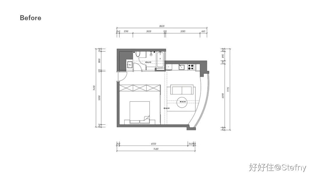 原始房型是标准的 1 室 1 厅,卧室有大量空间,其实使用的频率不高。为了让空间效率最大化,主要做出如下改造: