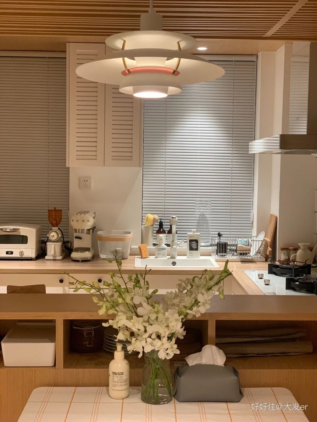 厨房整体选用了宜家橱柜,配合宜家内部的收纳分隔用起来很顺手。同时做了一处小改造,面朝餐厅的部分上翻形成「餐边柜」,增加储物的同时也保证了厨房台面不外露。