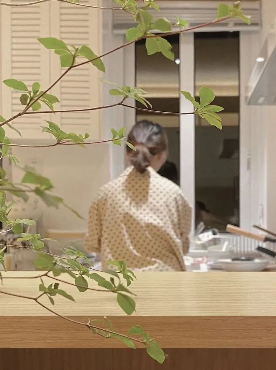 拆掉墙体之后,阳台作为卧室的延展空间,整体的调性需要与之契合。窗外有绿树一定要珍惜,搭配奶白色木百叶和麻纱,绿意可以影影绰绰透进来。