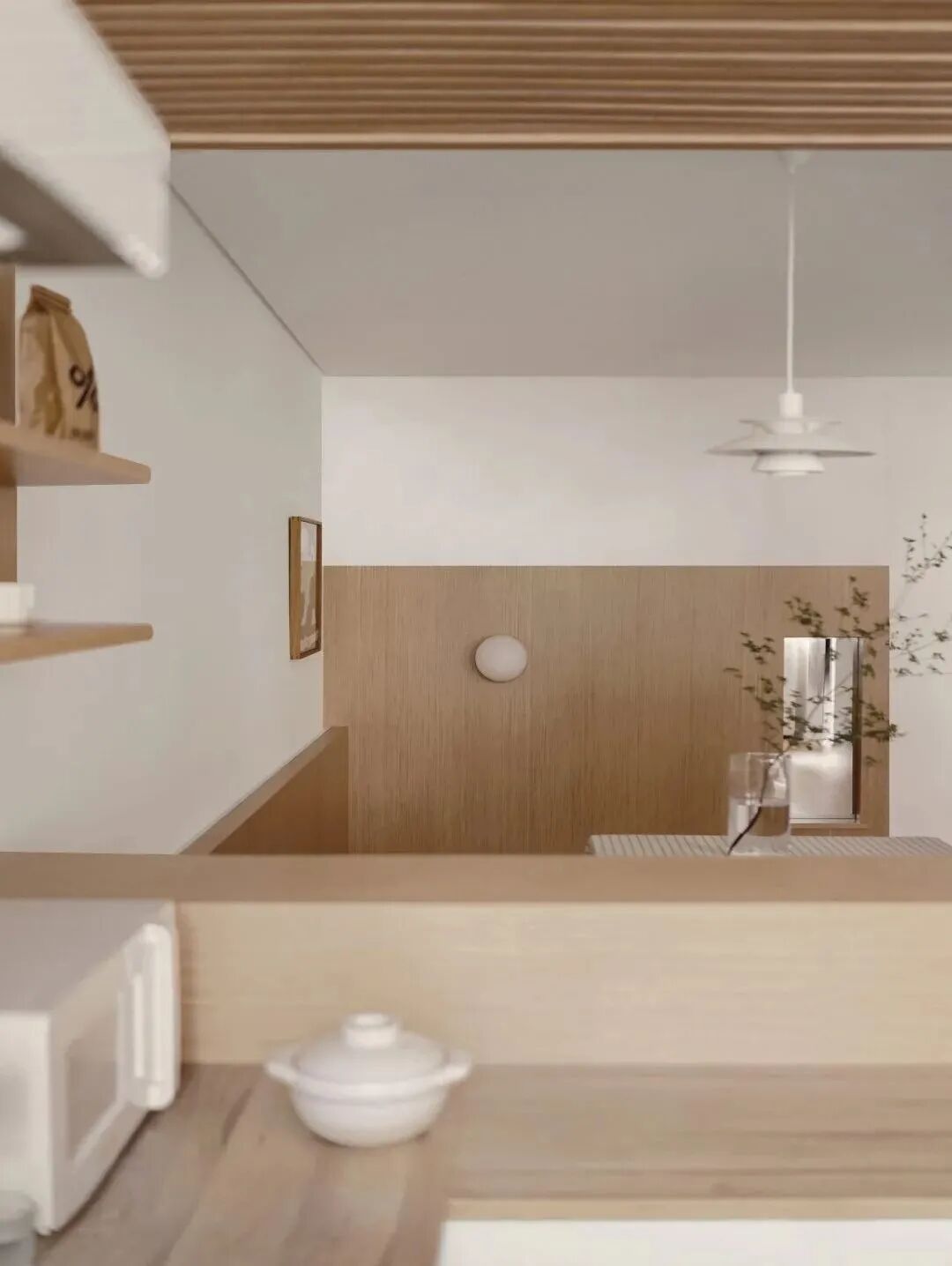 入户这里的框景很妙,加强了空间的纵深感。玄关作为厨房和餐厅的分界线,与木格栅吊顶一体成型的木隔板,同时与地柜形成呼应,可用于日常器物的收纳与展示。