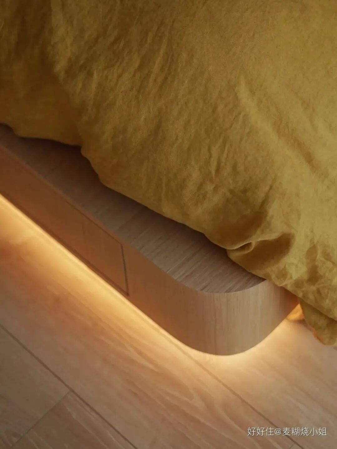 床体边缘都做了安全的圆角设计,并加了床底脚灯。作为睡前和起夜照明足够用,又不会刺眼,还让床看上去有了奇妙的「悬浮感」。