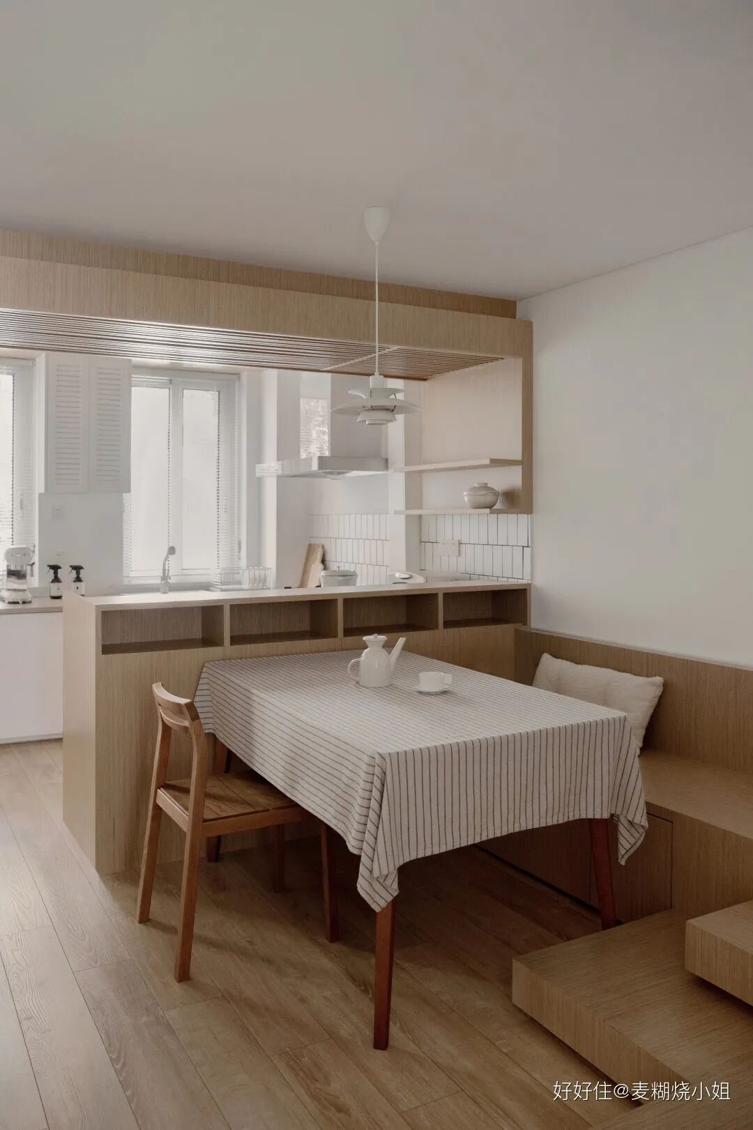 而告别逼仄与昏暗的秘诀,就在于日式小户型最常用的 LDK 设计,也就是客餐厨一体化。厨房橱柜、餐厅卡座、客厅地台既分离又联系,空间整体通透起来,瞬间显大一倍!