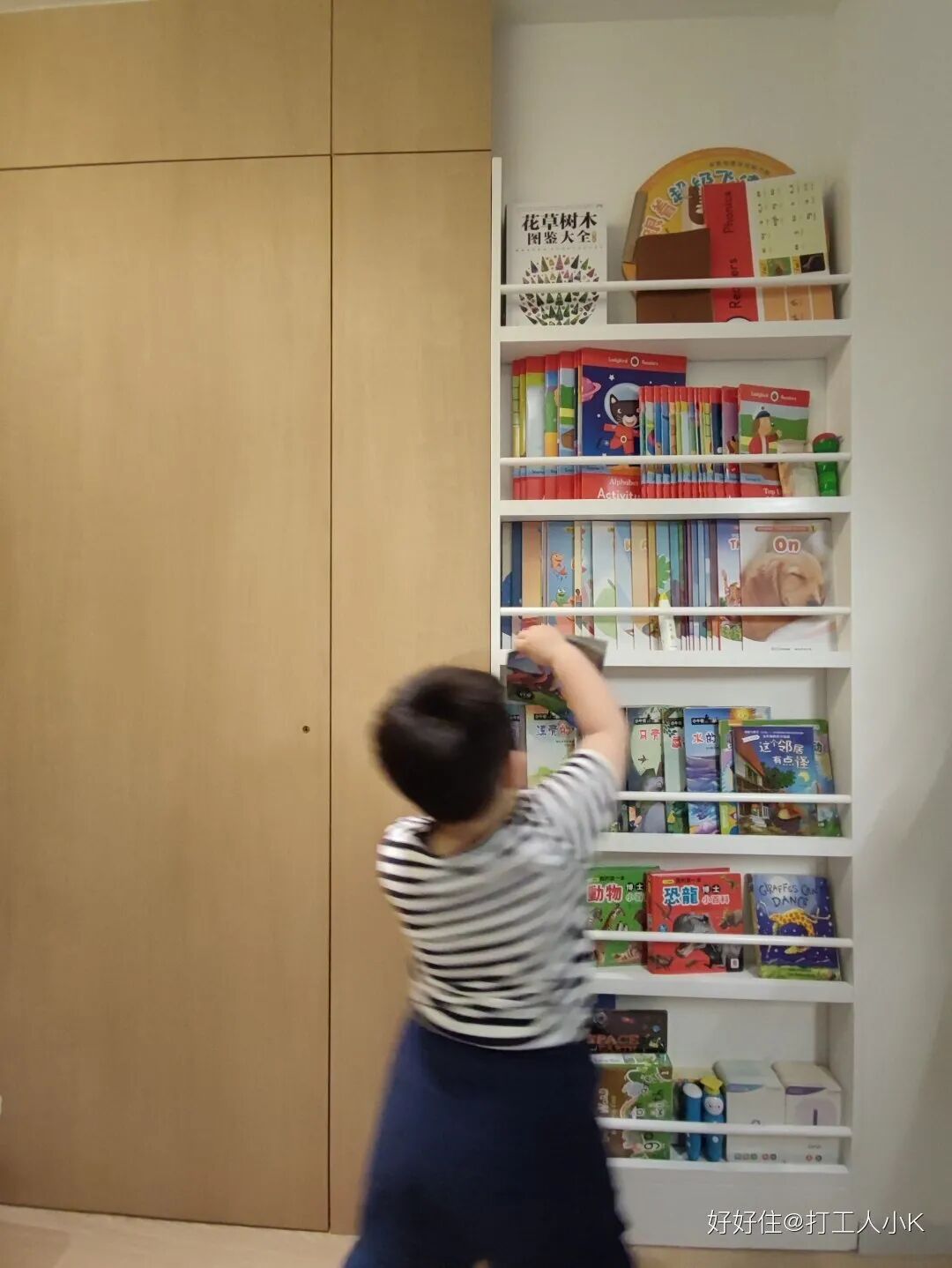 2 米高的内嵌书柜,能放不少书,而且一目了然,宝宝也喜欢在这儿看书。