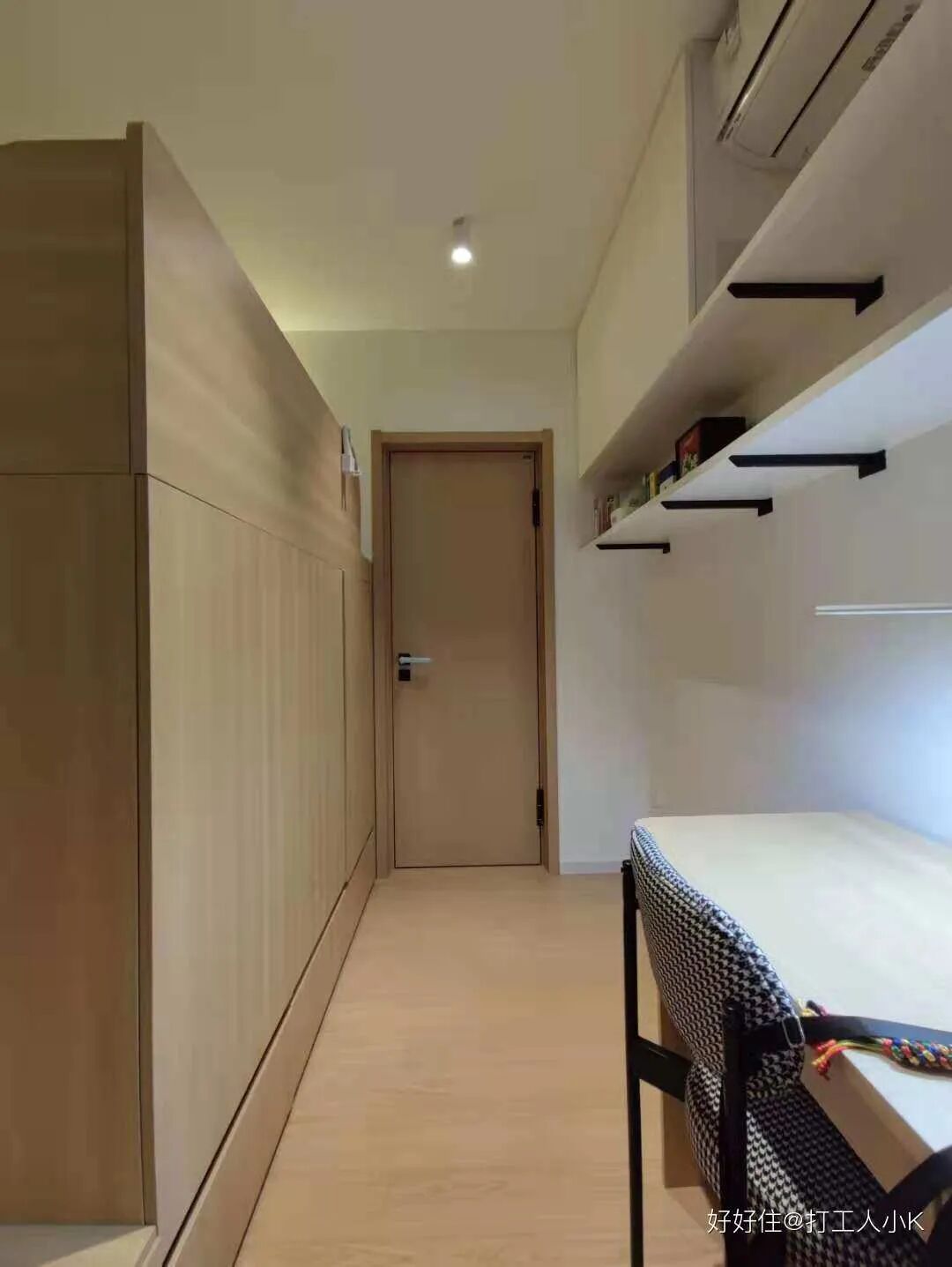 通往卧室的走廊,内嵌书柜+白板,作为宝宝的阅读区和画画区。