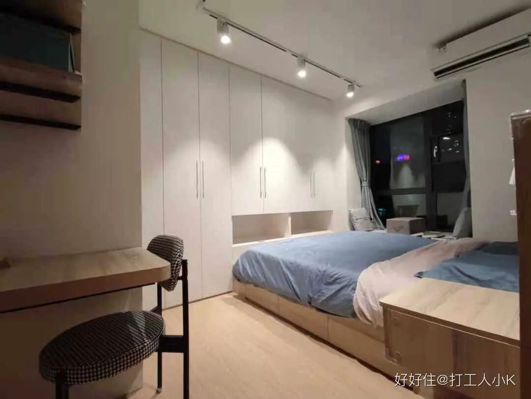 主卧作为全屋最大的房间,容纳了 1.8*2.3 米大床台、转角大衣柜、书柜+书架+书桌,床下还有超大空间存放换季衣物。