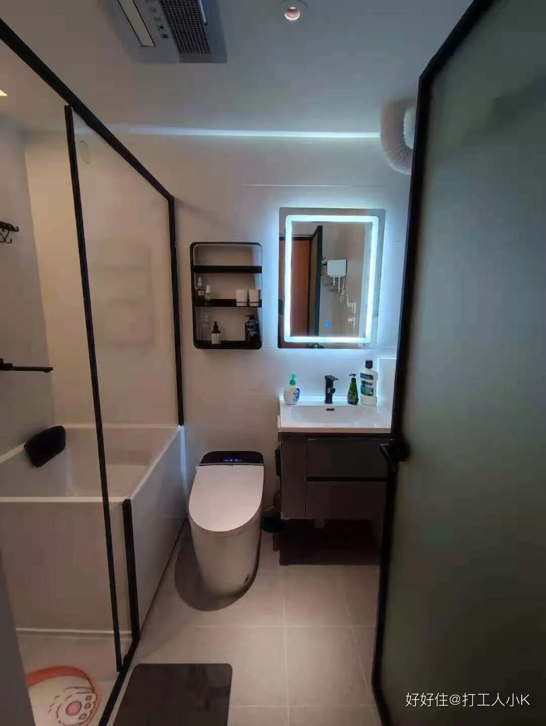 客卫也是干湿分离,淋浴间做了到顶的超白玻璃隔断,内置桑拿机+淋浴凳,搭配防水音箱和防水手机架。