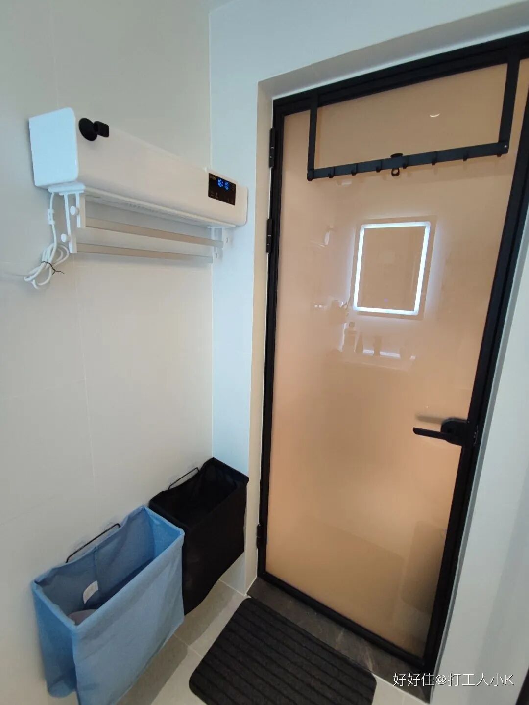 迷你空间塞了 3 台洗衣机 + 1 台干衣机,还有多层置物架放清洁剂。电动晾衣架,挂收都方便,还自带消毒照明功能,省去了阳台灯。