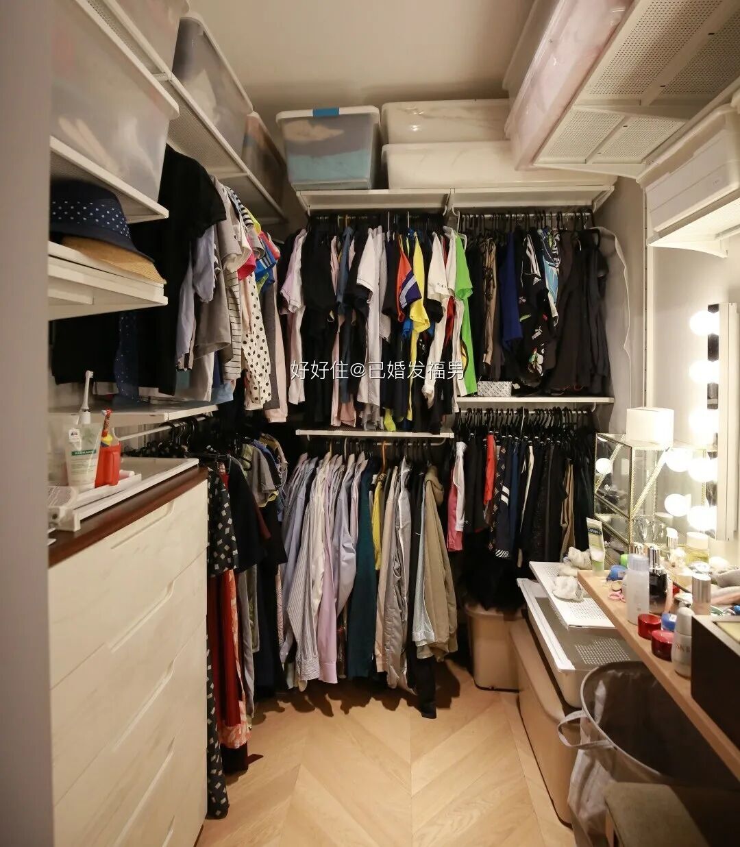 主卧没有衣柜,整了个衣帽间,这里也是妻子的小小化妆间。用的是宜家艾格特,省钱又环保。