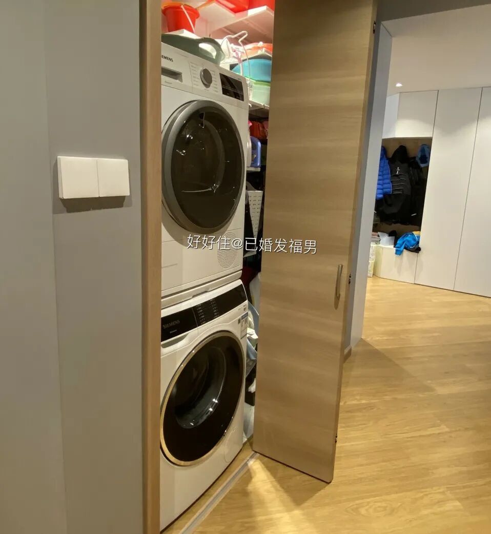 这个空间也没浪费,把原本的衣帽间朝南挪动一点,瞬间多出个洗衣房 + 杂物间。