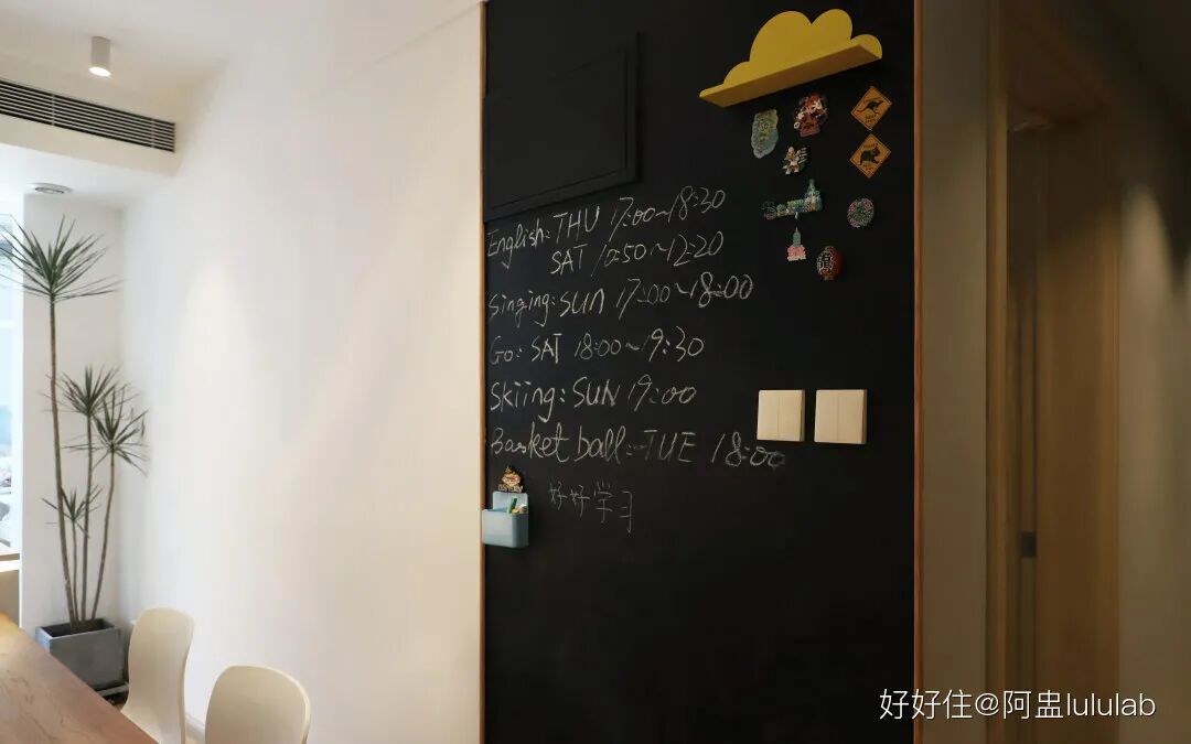 餐桌另一面墙刷了个磁力黑板墙,给小朋友涂涂画画,还能将电表变隐形。