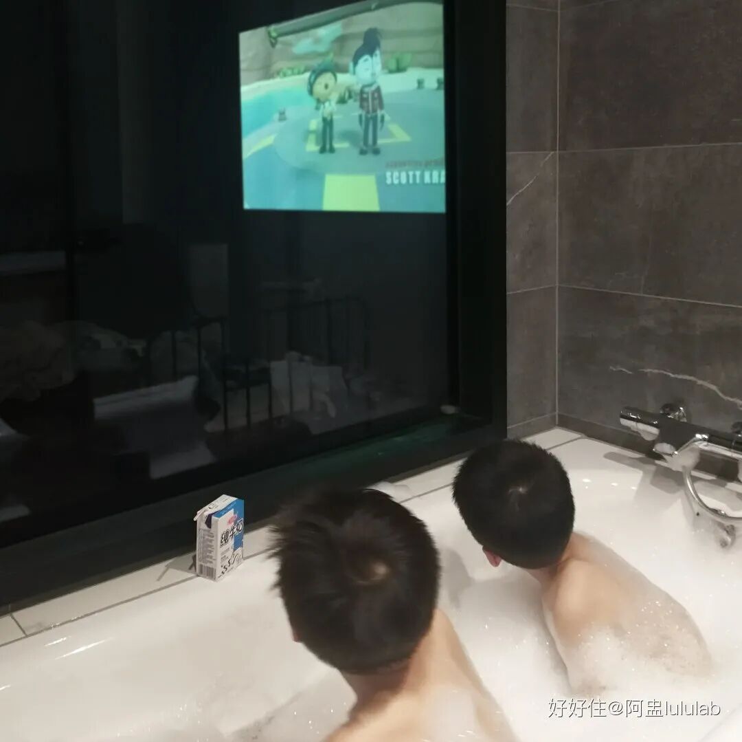 孩子和小伙伴在这儿泡澡,躺在浴缸还能看卧室里的投影,泡澡时间翻倍。