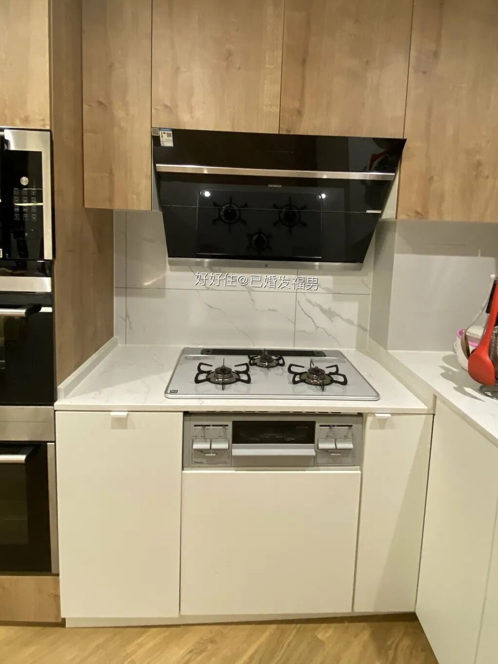 原本在灶台旁边的台盆,移到岛台后释放了中厨区台面空间。日式三眼灶自带小烤箱,偶尔来个明火烤肉串也很不错。